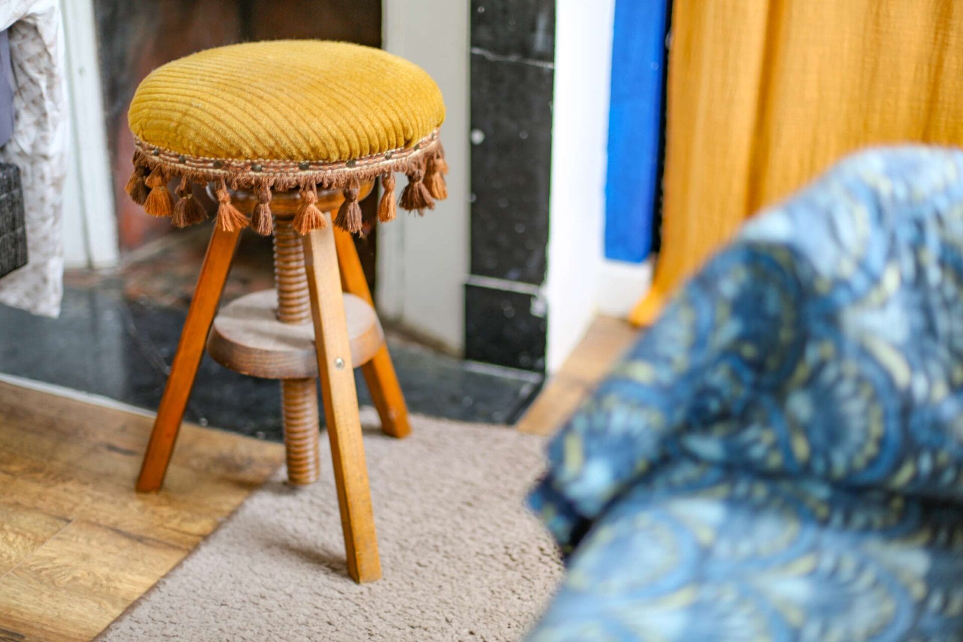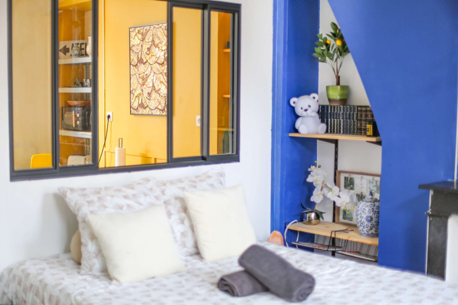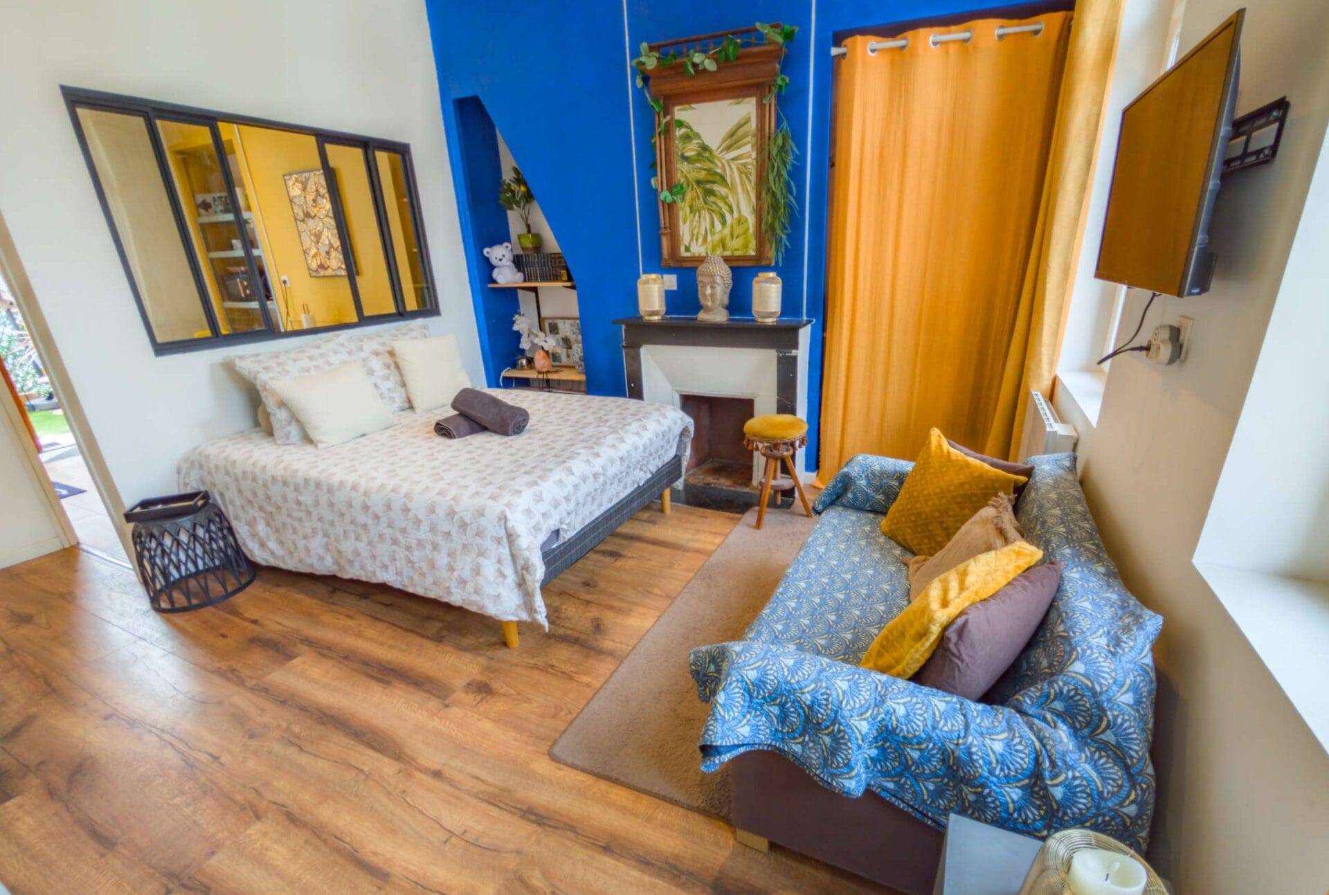 Un lit double ultra moelleux vous attend dans une pièce de vie chaleureuse, aux hautes fenêtres et à la hauteur sous plafond généreuse. L’ambiance est douce, cosy et apaisante.