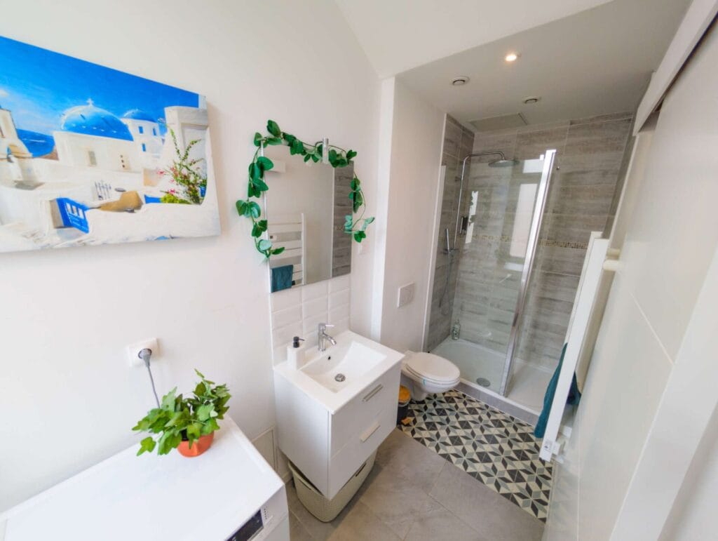 • une salle d’eau avec douche avec douche italienne et meuble vasque​ ainsi que des toilettes ;